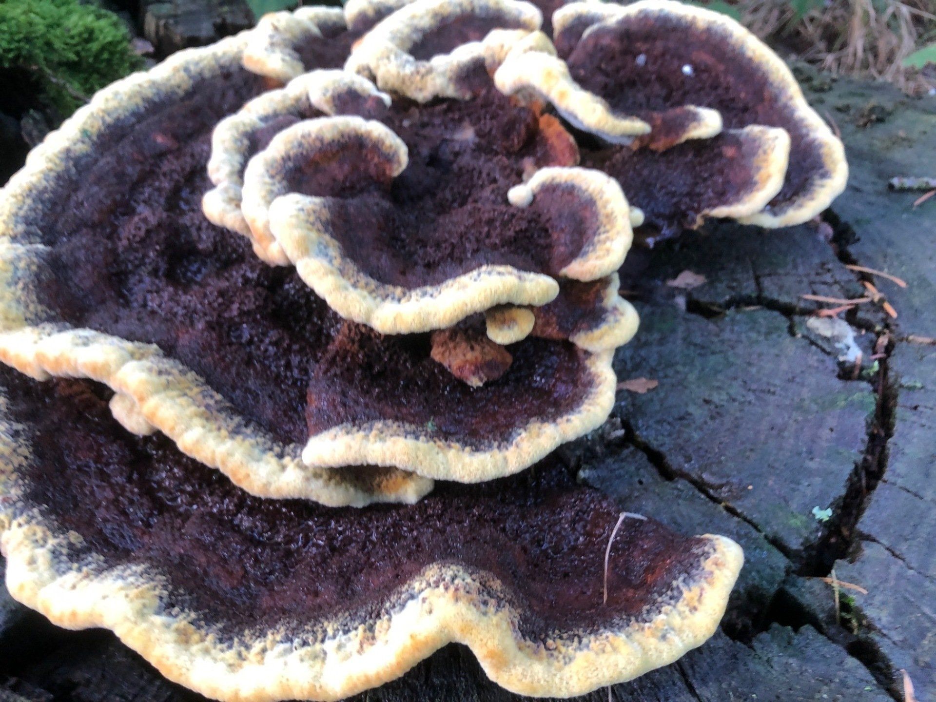 Na de zeer droge zomer is er in de maand september voldoende regen gevallen om ook weer grote aantallen paddenstoelen letterlijk uit de grond te zien schieten. In een ommetje van een half uur door De Hoevens zagen we diverse soorten. Van het gewone elfenbankje, berkenzwammen, valse hanenkammen tot gele en paarse korstzwammen kwamen we daarbij tegen. Het mooiste exemplaar was een uit de kluiten gewassen dennenvoetzwam van zo’n 30 centimeter doorsnede.
